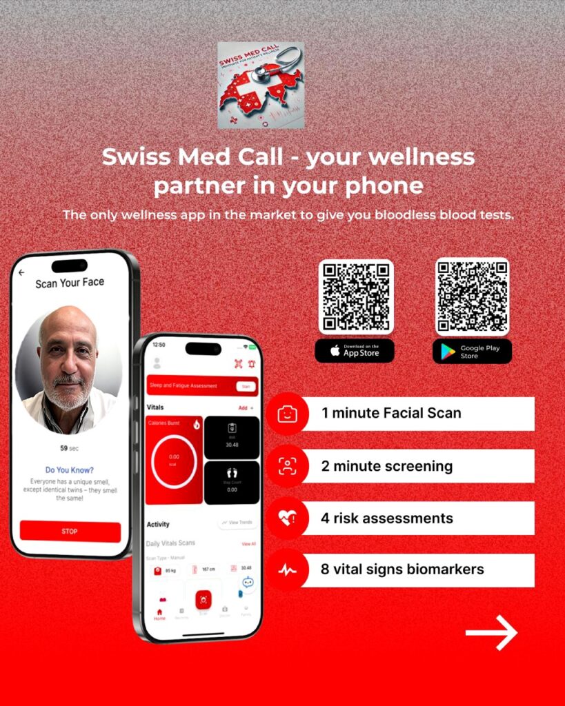 SwissMedCall.AI révolutionne la mesure de ses constantes (données biométriques) avec sa technologie IA de scan facial rPPG (PhotoPléthysmoGraphie à distance / remote PhotoPlethysmoGraphy ). En utilisant la technologie rPPG et l’intelligence artificielle, notre solution offre une précision inégalée pour des analyses biométriques rapides et fiables, pas invasives, sans prise de sang (Bloodtest Less) renforçant ainsi la confiance et la sécurité des patients/App Users.